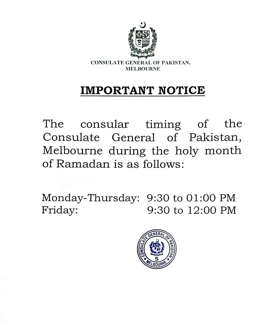 Consular timing during the holy month of Ramadan